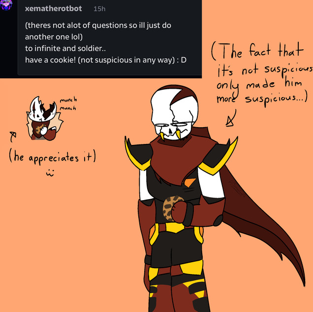 Drawingstuff36 asked: Can you confirm if your cooking abilities sans of killerouter (he clarify it in discord: can sans of outer killer cook based opinions?)Art belong to the creator of this account and take: