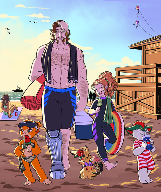 Watching the sea: Megatron, Whril ( the girl ), Rodimus and Swerve. Skywarp is carrying Nautica, Thundercracker is with his dog and Starscream is holding a lollipop.