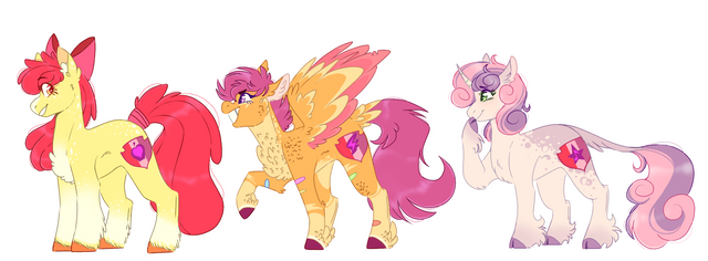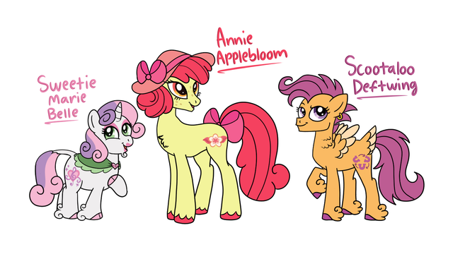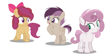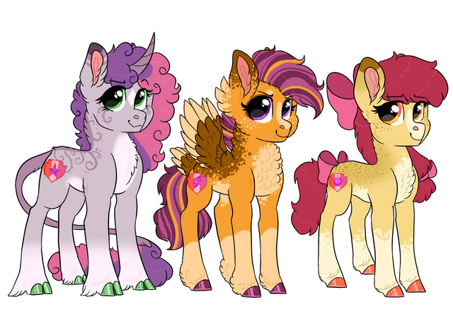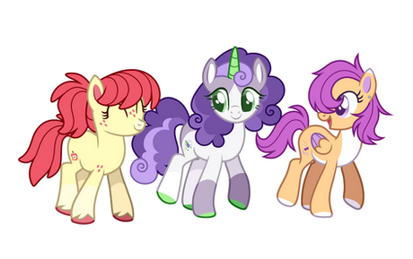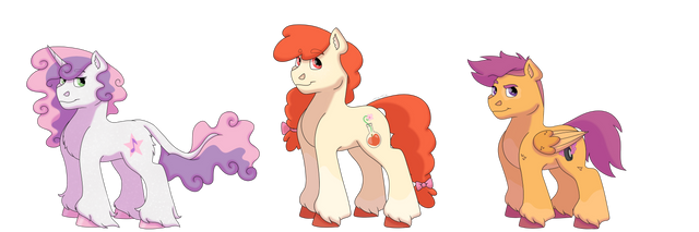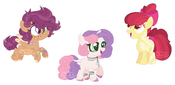 I realised the other day that I've never redesigned the cutiemark crusaders (at least not in a while) so I decided to give it a go! Here's a couple notesScootaloo