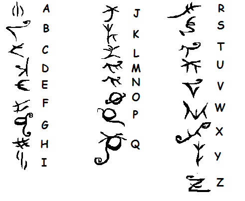 The Rimorian Common alphabet comes from those originally able to speak and the first of the Rimorian people to have any form of written text, The Na'gaan. The Na'gaan are made up of the lamia/naga, echidna, gargoyle, and dragon races. In Rimoria's early days they used to live among each other as one people and called themselves "The Na'gaan Civilization". However over time they went their separate ways and founded their own separate lands and although there are still remnants of the Na'gaan Civilization scattered about the lands such as ruins of abandoned structures, the races which made up this civilization and the language they all shared can still be and is still referred to as Na'gaan.