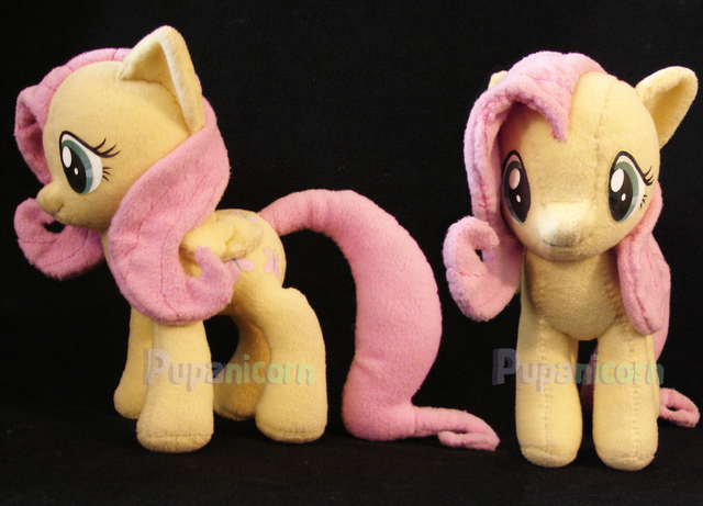 Fluttershy is made from banana and light pink Shannon Cuddle 3 minky using my own pattern. Her embroidery designs were digitized by Epony and stitched using my bernina 560 and Sulky/Isocord thread. She is stuffed with poly-fiber fill. She stands at 11 inches tall (at the top of her head). She is mostly machine sewn, but she also has many hand sewn pieces stitched on using thick carpet thread. Although the thread I use is strong, she is not intended for children.