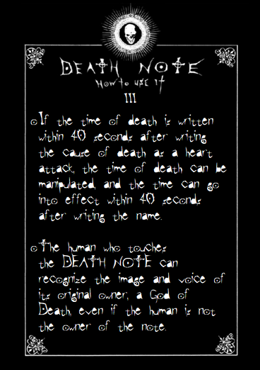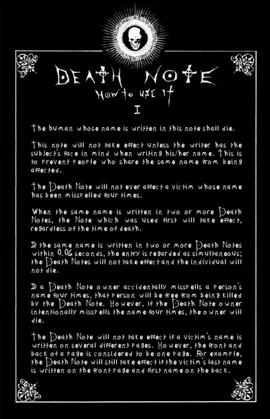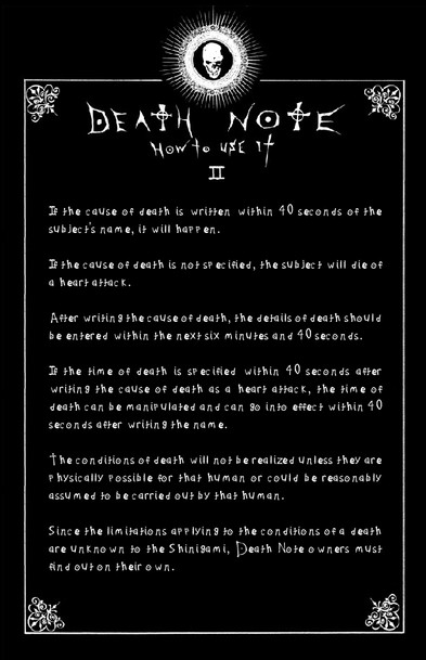 um...death note rules (how to use) i also used the death note font) (ther might be some typos but i think its ok..)sorry,i don't have the other rules but i hope i will make the other rules soon...