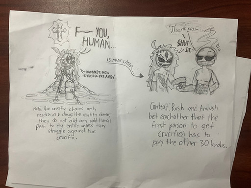 Azazel is the quote on quote “Actual” antagonist (I think) but I thinking about making him kind of pure evil since he was pretty much the one that turned Lorelai and manipulate her into a “Dark” Magical Girl.. so I’m also thinking about how the antagonist will get defeated and I’m thinking about having the antagonist getting cuffed in chains on his hands and legs and sent to some kind of domain similar to the “Ketsubon Kyō” or something like that…Quick note I had to painfully do a lot of research or ideas to make this OC…. 💀