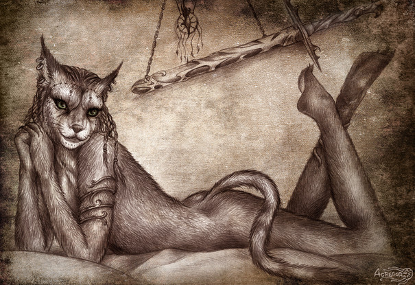 You manage to capture fur texture in a way few artists can I can see the fur quite well, but it doesn't obscure the natural shape of her body, which a combination of shadows and clothing help to bring out. You're clothing and accessory designs also feel very appropriate for the character here! I love the places where there's a little bit of fur flowing over the clothing; this actually goes a long way to making the drawing look realistic!