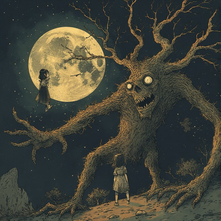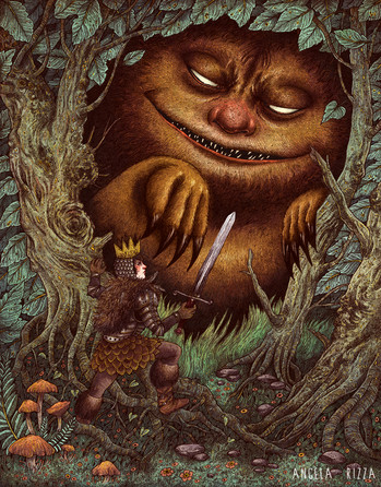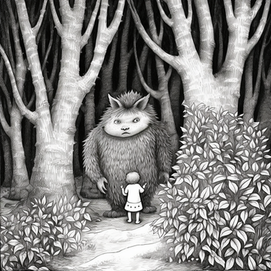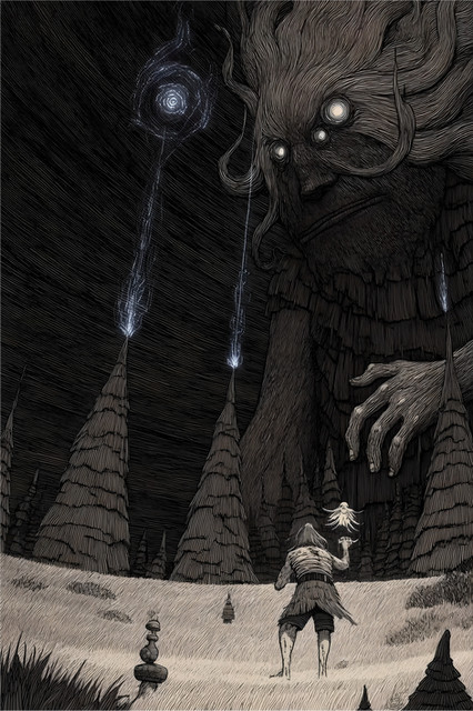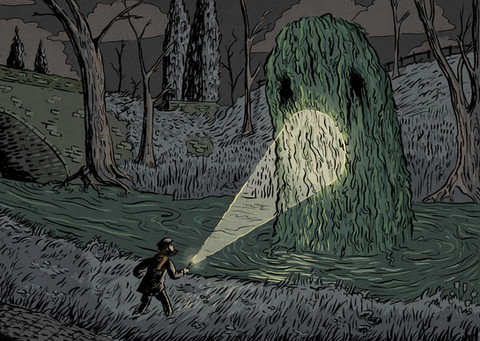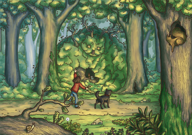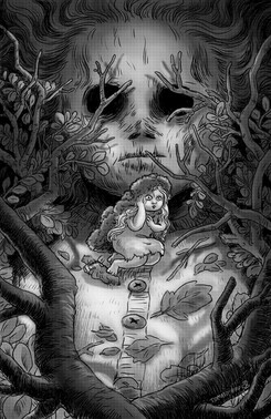 Nice work!Β It took me a while to notice the thing has arms/legs.Β It looks like just a tree with a face, but now I see it's a whole monster camouflaged as trees.Β I also like your style of inking, and the way the leaves and plants sort of become a frame.Β It reminds me of children's books from the olden days.