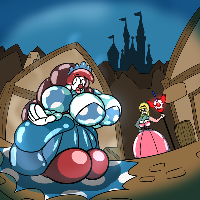 The pink top of the dress shot forward as two massive breasts expanded out over his round stomach. They pushed together sounding like rubbing balloons. They must have been G cups. He squeezed them and they honked like a horn. The crowd laughed and he laughed. He was starting to feel much better actually. Rainbow shoulder poofs finshed the look of the big elegant dress.
