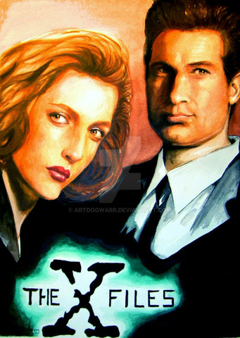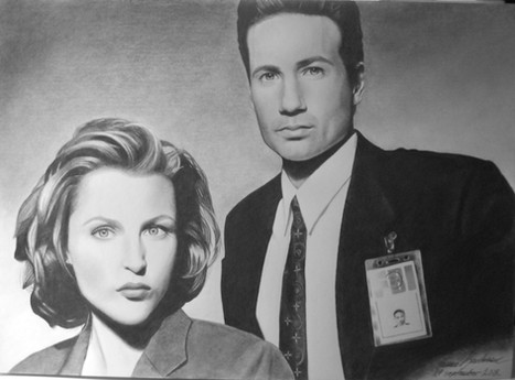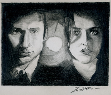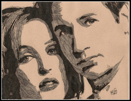Erm... oldish piece....done in summer '07.David Duchovny as Fox Mulder and Gillian Anderson as Dana Scully.