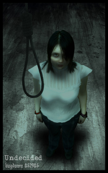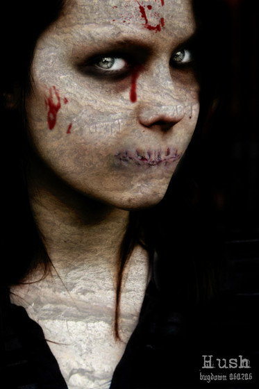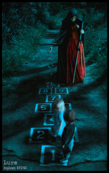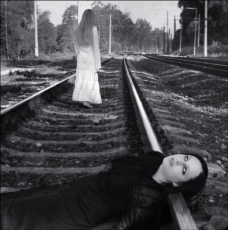 I love this picture. I love how the white dress the girl wears seems to symbolize innocence in contrast with the rest of the dark backround. Great Job.