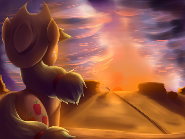 It is the perfect image as Applejack leaves Canterlot in search of Twilight.Β She has a long and perilous journey ahead.Β