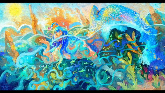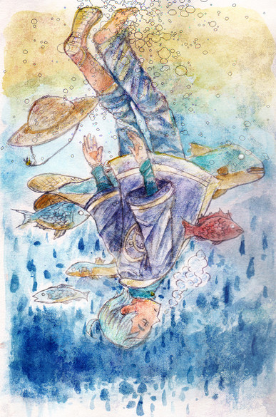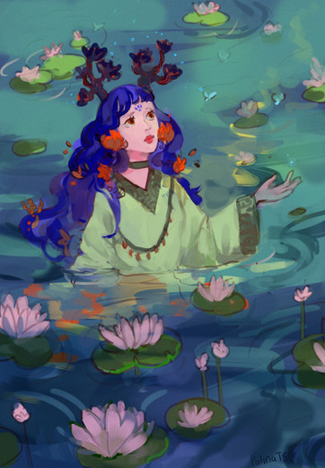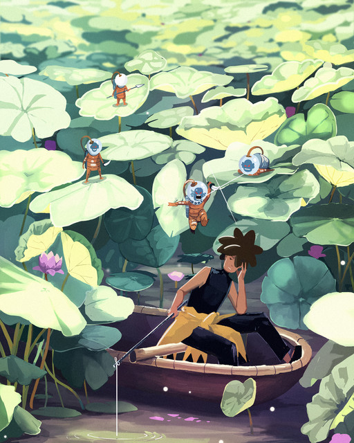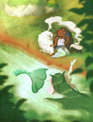 I was going to tell it in narrative form, third person, but then i realized i suck ass at writing, so i'll just explain to u what's happenin in the picture :,). SO BASICALLY-Nark, mi bBBBOI in the boat, has ghost datsu/Needlefish fish and he keeps them close to his ears to hear their whispers; they tell him when ppl are lying. This story is like a major WIP. He was told he was the son of the water spirit and searches for his mom and/or dad :,), and in the scene he believes that Baw (waterdog) is his mom. With Nark still convinced that she is his MOM after weeks, Baw offers to help him find his real mom- so that he leaves her alone. lmao