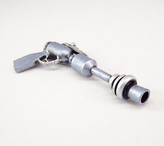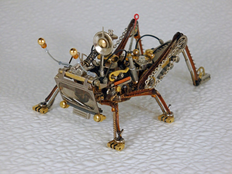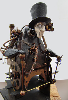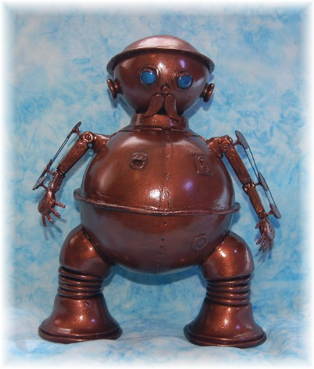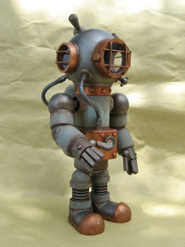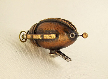 Two small nostrils above the dome allow for the intake of dry air to be mixed with the internal watery environment. The poweful, jaw like hand grabber below has a very long arm, along with six fingers and two thunbs (why on Earth would you need ten digits between two hands? Humans...). Connected to this is a strong spot light. Sensors abound inside this marvel of ichthylogical machinery made from spun copper, a supmarine (above water) vehicle taller than a man and ready for action!