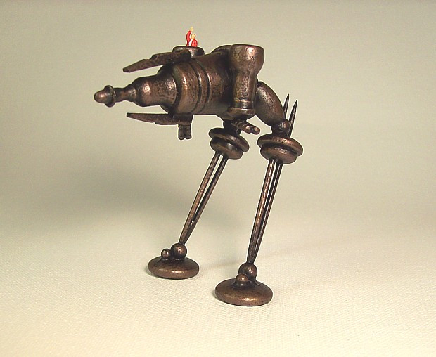 These very sturdy walkers (hey, how do those land animals balance anyway!) are made with powerful mechanical legs with a foot and ankle system that has MANY joints as well as overall a broad stance. A "fish eye" domed front view port allows for a wide angle of visual exploration (through which can be seen a few of the controls including those for the feet as well as the fish pilot if you look VERY carefully). A top hatch allows for entry and exit (under water). A small fish tail rudder, is, well, normal, is it not?
