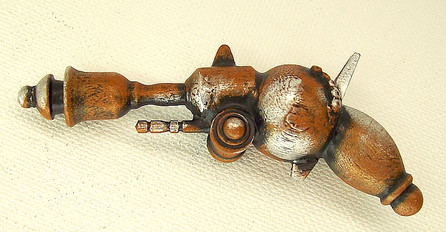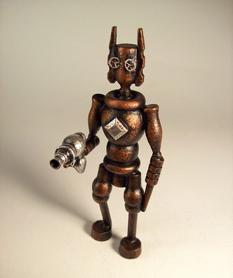 Made almost 100% from wood (sometimes with tiny amounts of other things) I paint and / or finish these with dark undertones and shading to highlight the details and then use layers of metallic and / or other coloring and finishes, making sure a lot of details shine through, often even the wood grain despite high tech themes. They maintain an often retro, sometimes even rustic look and feel to them, like an "olde worlde" toy or something (some more so than others).