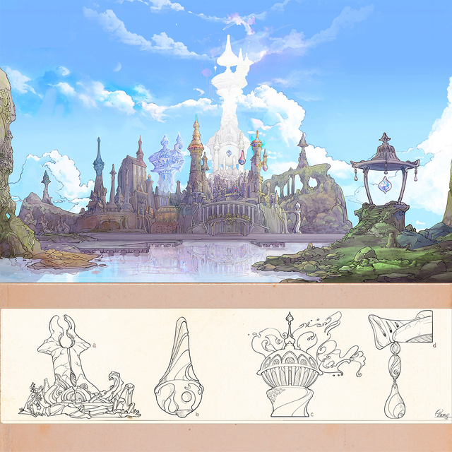 Fantasy castle with sister castles in the vicinity, set next to a steep gorge with waterfalls and looking out over spectacular mountain scenery.Architecture might be considered a blend of fantasy medieval with some kind of retro-future characteristics.