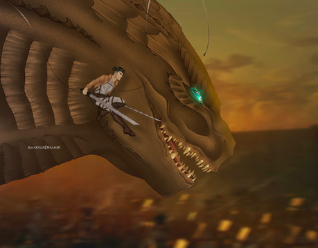 Mikasa: The titans stampeded across the horizon. The entire garrison gathered on the wall to repel what we thought was a massive attack. It didn't take us long to realize that the titans weren't attacking... they were running. We all asked ourselves what could make the titans run in terror, and then we saw him standing like a mountain before us. The creature turned it's gaze toward our unsuspecting city and gave a mighty roar that made even our mostΒ honored soldiers feel utterly powerless. This wasn't another monster like the titans, this was a god...