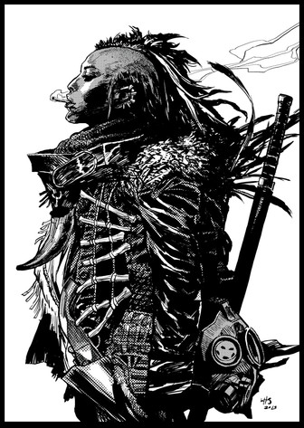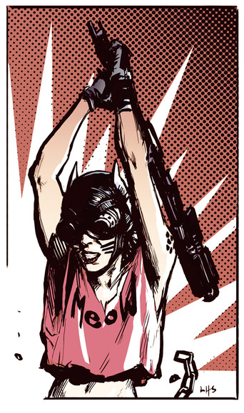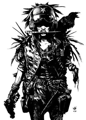 I´m still way into Frank Miller´s old stuff. I think I´ve actually picked up lots of influences from his work. I wouldn´t say he´s super clean, I like other artists who are way more anal with their linework (like Brian Bolland for one) but I tend to go more for rough, looser styles. How I go about drawing varies. The first post apocalyptic one I uploaded here (the one with a profile shot of a girl smoking) was drawn in pencil in my sketchbook, scanned in and inked digitally, the one with a girl and her dog I drew a quick layout sketch directly in ink as well as some different faces that I scanned in and then worked it up digitally from there, the one with a one armed woman and a bird on her shoulder was pretty much all digitally from scratch. I do enjoy more combining traditional with digital.