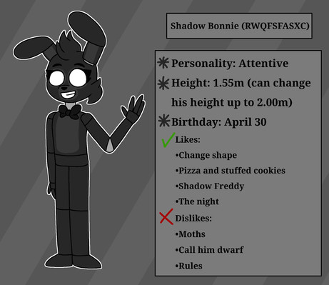 Español:Ante ustedes, les traigo a Springtrap, el conejo destruido y sarcástico de toda la pizzería; además de ser un amante del queso en todas sus presentaciones.