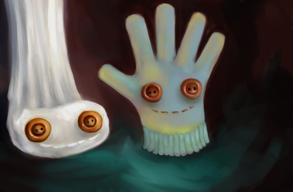 Beautiful colours! The different halves of the painting make me want to explore the area more - a very curious looking world. Especially curious with noseless creatures with beady blue eyes and little chicken-feet, hmmmmmm...