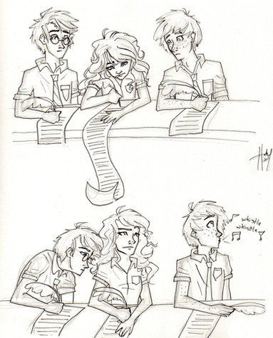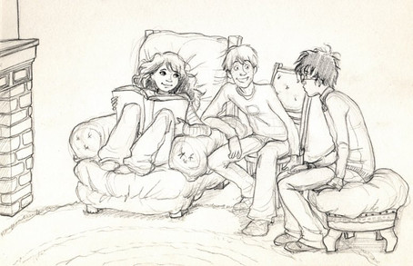 the trio at their finest, i believe. around their 6th year, perhaps? i feel like that was their happiest time. HOKAYY, too many reasons were brought up for this to be their happiest year. goodness, i must've been thinking about Harry and Ginny or something. :Calso, Harry's trying to scorch that bug, but has had no luck. for those that didn't catch that.
