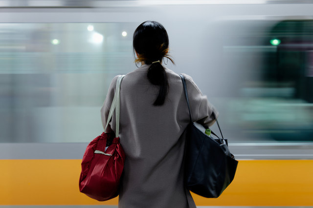 Yeah that's what initially made my do a u-turn and come back for this shot. It's not uncommon to see women wearing kimono in Tokyo. But once I realized that it's purple and she's standing at the Chuo-sobu line (yellow stripes) then I had to come back and wait for a train to pass. Luckily no one else came to wait for the train behind her and block the shot.