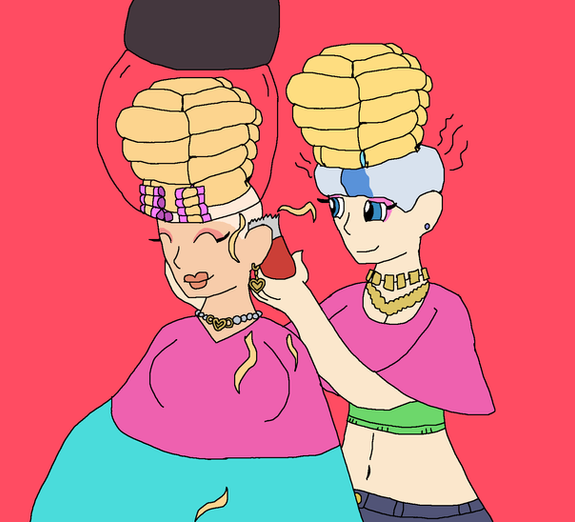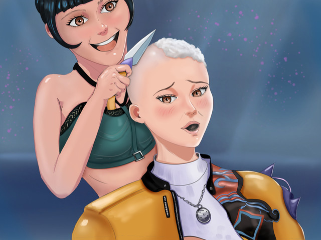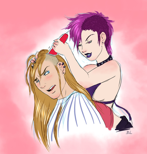 Bayonetta and Palutena give Samus a much needed haircut after giving each other theirs.I know they aren’t exactly Princesses, but it’s the second part of the one with Peach and the others, so I figured I’d keep the title. I might even make another one some day.