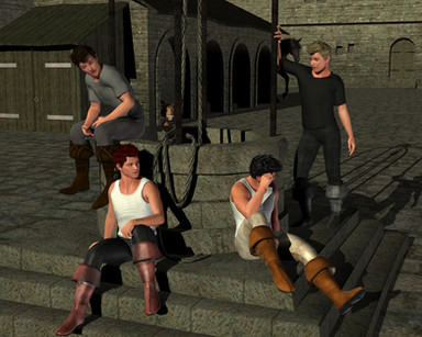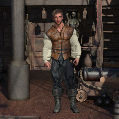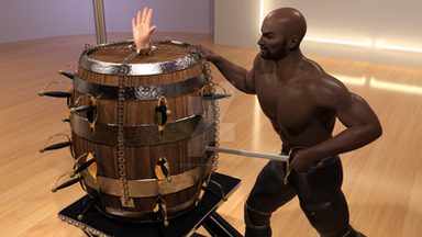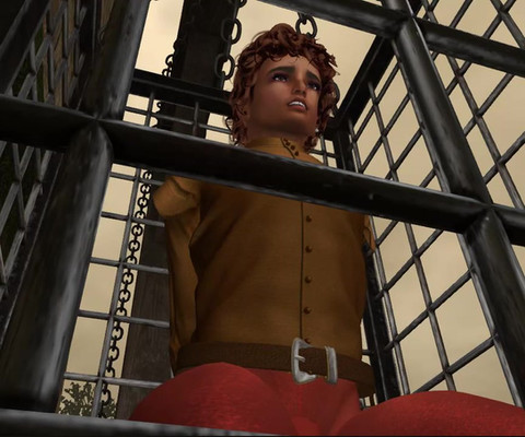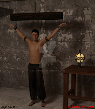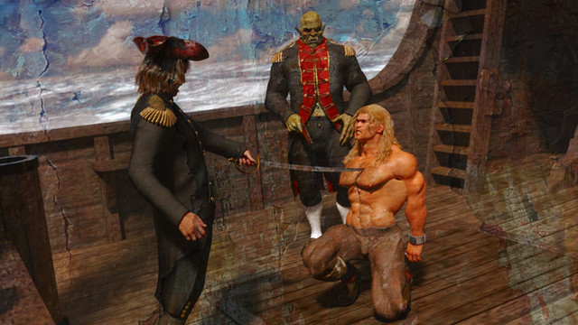 This is terrific! The victim's costume looks so handsome on him (the bloused sleeves with the shackles around the cuffs, the spread and drape of the waist sash), his defiant expression is perfect, and the maiden looks so invitingly cruel.