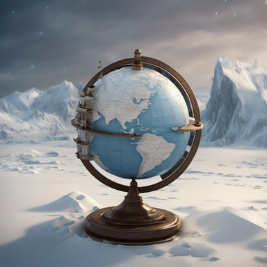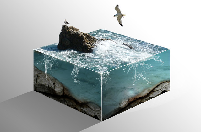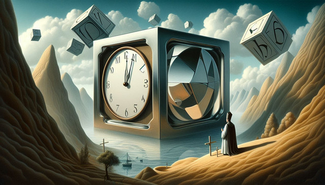 An acrylic painting of a mountain landscape with a lake. In the air hangs a huge die. Surreal effect.Colour palette is blue, white and black.