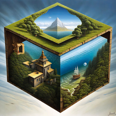 #acrylic #boardgame #cube #dice #fantasy #gamble #game #lake #lose #mountains #painting #reflect #reflection #surrealism #win #surreëel