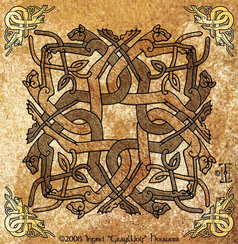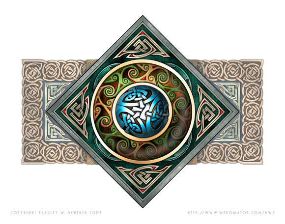 These are all digital, though most of the Celtc work started out on paper. I have a huge folder - well, it's really more of a pile - and border and panel designs I did whe I was using a lot of this in watercolor and ink work, back in the 80's, and I'm drawing on that older work for ost of these. So for the most part I'm scanning my sketches and painting them in Photoshop. I use its airbrush and line tools a lot, and there are some filters I use to kickstart lighting effects - especially over the big areas; and I often mix in some fractal or natural textures over the body color of the design. I've been asked a few times over the past few days how I did one or another of these and the answers would just be so long, assuming I can even remember everything , because different areas of the designs get very different treatments to ultimately arrive at the same sort of place.