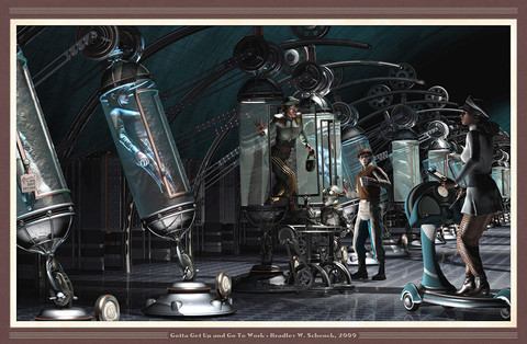 It's sort of hard to say how much time went into it, since I'd built so many of its parts, separately, over a long period. I think I'd started the city about three and a half years earlier, and came back to work on it repeatedly; I wanted (we;;, I still want) to do a long fly-through scene in there for an animation. And I worked on the chracters over about a year and a half before this picture, and so on and on. The picture itself came together very quickly during my Christmas break from work, probably in one to two weeks, along with another one I was working on at the same time. But like I said, so many of the parts had been keeping me busy for so long, there's no way of telling how much actual time went into it.