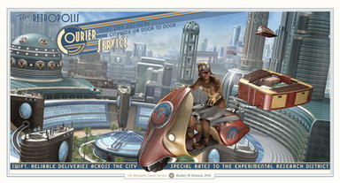 "Retropolis" is the name I've given to my Future That Never Was, and now it's also the name of this wild, movie poster-style montage of the places and people that fill that world. It pulls together a lot of elements I've been working with over the past year - in fact, I think I started the city itself about three and a half years ago - into one big joyful conglomeration of retro-futuristic enthusiasm. I'm pretty crazy about it, as maybe you can tell.This is a city so big it has weather. Like in weather patterns. Don't mistake the fog and clouds for pollution, since that's not a problem here; the City Of The Future used to always be about transportation of a sleek, modern and desirable kind. This is no exception, with its thundering monorail and its high-flying, lighter-than-air airships - but it's not all public transportation either, since we were promised flying cars. Here we finally have them in the form of open cockpit roadster rockets that burst right out of the heart of the picture.