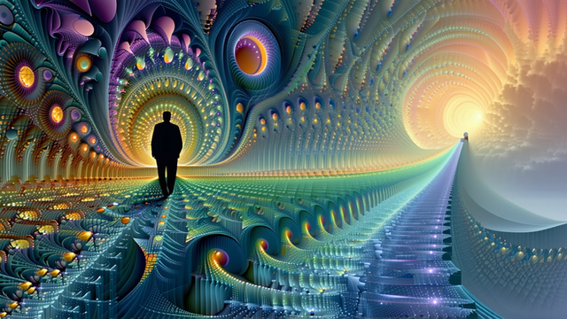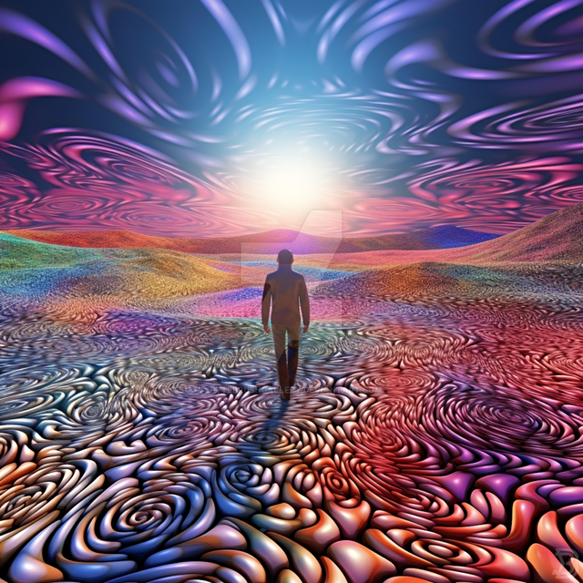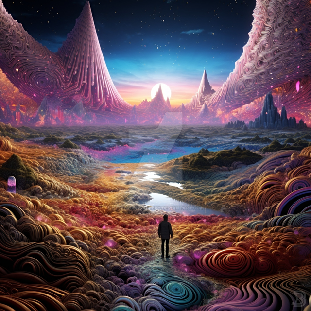 A lone figure stands at the commencement of a path that delves into the very fibers of his being. This journey is not through space, but through the self, a pilgrimage through layers of consciousness and the fabric of the soul. At the end of this path lies enlightenment, or perhaps a deeper enigma, as the traveler seeks the truth of his own existence within the infinite folds of his inner universe.Find this piece and more like it on a wide range of decor and prints atΒ bytebrushprintz.etsy.com