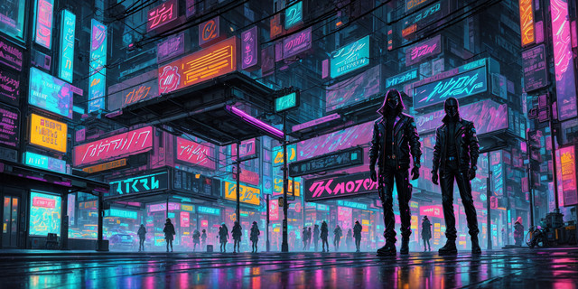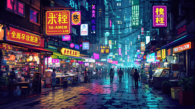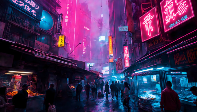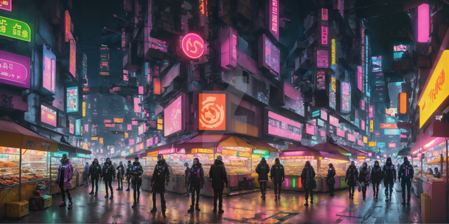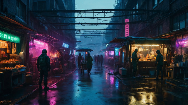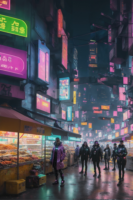 #ai #black #city #cityblock #cyberpunk #gimp #green #market #neon #purple #rain #street #wet #yellow #gimpphotoshop #aigeneratedart #aiassistedart