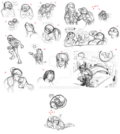 I kinda see what you're getting at with Mikey at the end. But I don't think it's as big an offense as some of the other Mikey's I've drawn. I can kinda get away with saying he's hamming it up for Rap's sake XDDD because apparently, from what I've read MANY fans say, Mikey has NO problem pulling Bambi eyes at one of his brothers if he wants something.