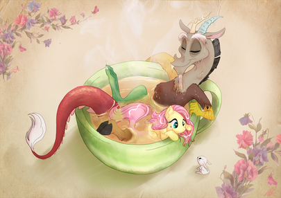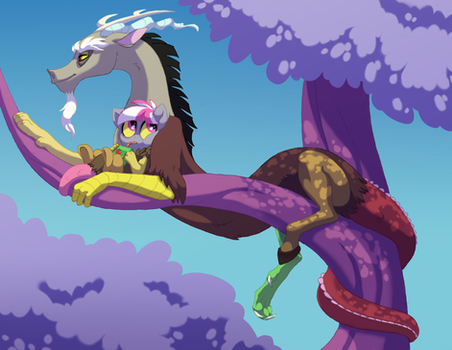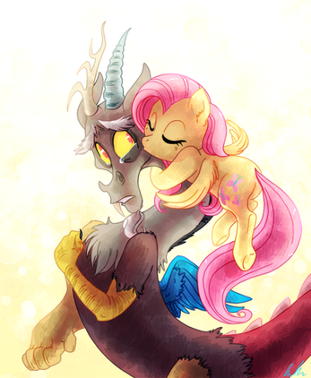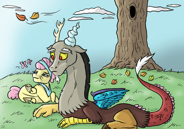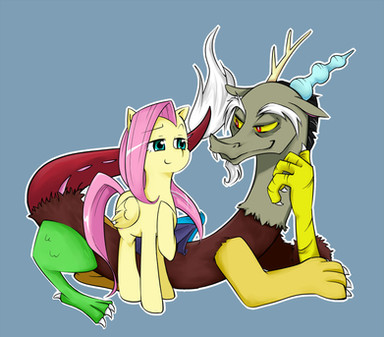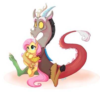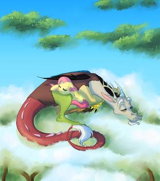 That sounds like a good Fluttercord moment that can possibly happen in the show. Discord loves chaos, but had he ever just 'chilled out' before? I love the fanart, it's cute and well detailed. I especially love Discord's expression, and Flutters resting his tail like the tree-branch he rests on.