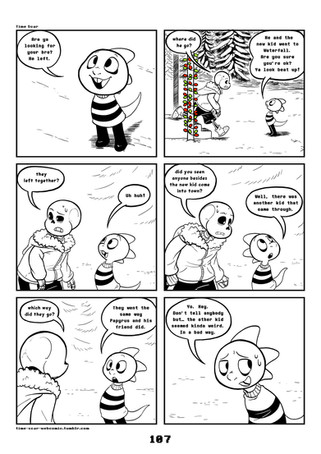 Lol looket those un-detailed trees! They still look good. I also like how the backgrounds go from detailed, to less, to not at all. I don't know what it is about it, but the transition feels fitting to me. Like in a short second, what Sans sees is no longer there and it's just replaced with uncertainty.
