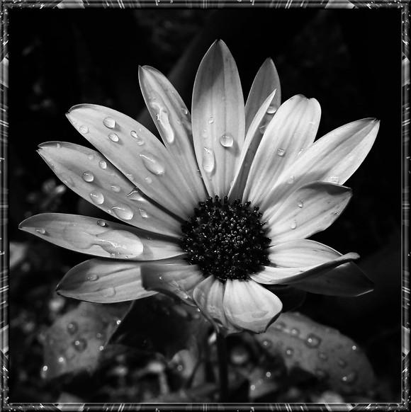 The B&W works great in this photo bringing attention to the shapes and textures. I love the way the center of the flower looks like crystals. The composition and focus are excellent.
