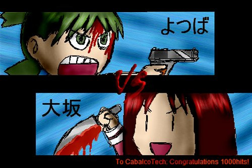 First off, Osaka's (or at least the girl at the left) right leg is REALLY, well, odd. It's kind of a hard do draw pose anyway, but it seems like that leg simply stops from the knee. I think we should be able to see her right foot too. Then again, it's kind of a difficult pose to draw. Just wanted to let you know.