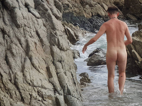 It is going to take me a while to sort out all the interesting things in this photo.Β How the angle of the back matches the angle of the rocks in the background.Β The contrast of the solid rock and the mobile water.Β The droplets of water on the long, smooth back, suggesting cooling evaporation in the hot sun.Β So much.