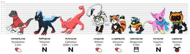 Dietto + Ailurumon // David + Penpenmon // Ada + Foxymon // Victoria + Alenmon