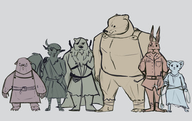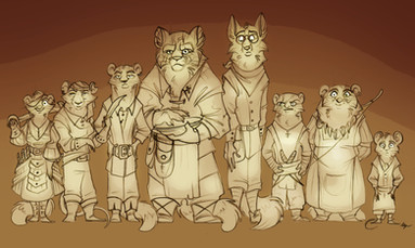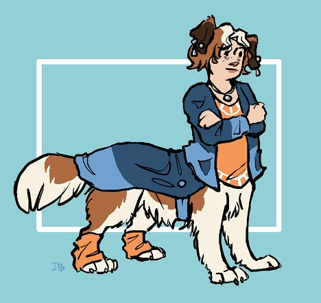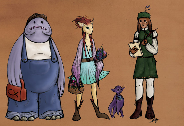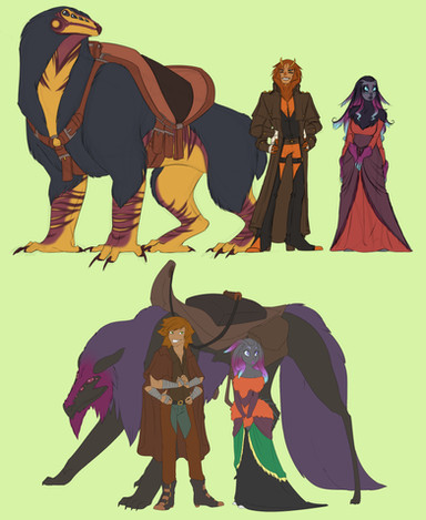 [Image description: Interpretations of four characters from Ringworld by Larry Niven. Teela Brown is an energetic white woman with brown hair, wearing a four-leaf clover necklace. Louis Wu is a confident mixed-race man who is bald with a long ponytail. Nessus is an anxious white and brown alien with two βheadsβ and three legs. Speaker to Animals is a large, orange catlike alien.]