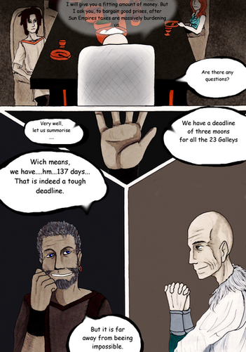 A 3 panel Dune comic. Piter is a short white person with long dark brown hair and fully blue eyes. Baron Harkonnen is a tall, fat white man with short red-brown hair.