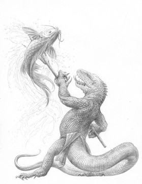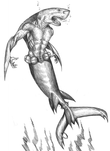 Sharkie was one of eighteen creature/characters that I created for a roleplaying game called 'Godsfall'. Aside from the look of this piece, I was particularly pleased with the composition of the image. So...I like him too, Arianna!