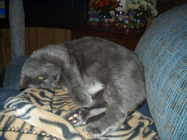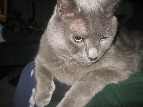 His former owner apparently kicked him, so he was kind of agressive at first, and he used to bite, so we named him Nipper and my half-sister started calling him the devil kitty.