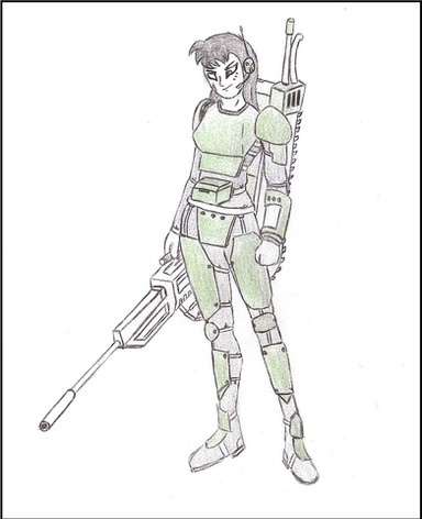 After securing the area, Pack leader Alpha Kriste Fallas pauses to remove her helmet. Pack leader Omega Ravis Mastu waits for the order to advance.Ok it works like this. The Cerbine Grand Legion, orginizes its squads of infantry differantly than the U.E.A.F. Each squad, or "Pack", is orginized like a wolf pack. One alpha leader, and one omega leader. They are essentialy the same. The reason for this is that if one leader is killed the squad can still function effectivly.