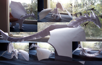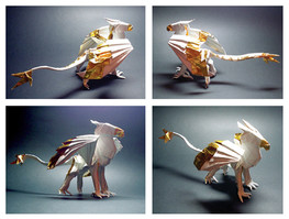 So some backstory: I saw gustpath's Gryphon [link] a few years ago and was struck by how well the model was folded with its wonderfully done color-changed gold trim. Of course, I immediately attempted to recreate the model via his [hard to read] progressive photos and crease pattern. This was probably when I was barely familiar with reading crease patterns. I failed, and filed it away for future consideration. I attempted this model several more times over the course of the past two years, all without success. Much more recently however, I decided to give this project one more try, considering I had grown much since designing my own models. As you can see, I've managed turn out a successful model, albeit not nearly as nice as guspath's original model. Certainly not my neatest work, but I'll take this small victory.