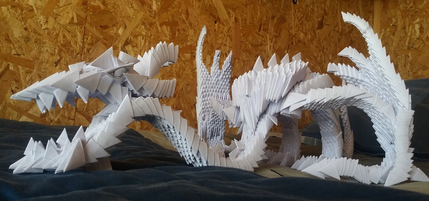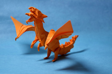 I tried my hand at folding him in a sitting position, a pose you don't see too much in origami dragons. Methyll cellulose applied to hold the details.