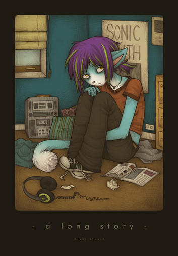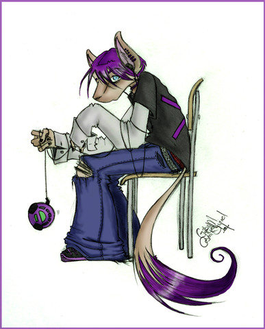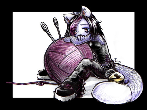 There's something about this picture that just gets to me. You can feel so much looking at it... *hugs you* I love the way you did the hair over the face, and how very much like you you make the Kimberly cat look. Those feets are so cute, and the shading on the pants is awesome. Cheerup. I love you.