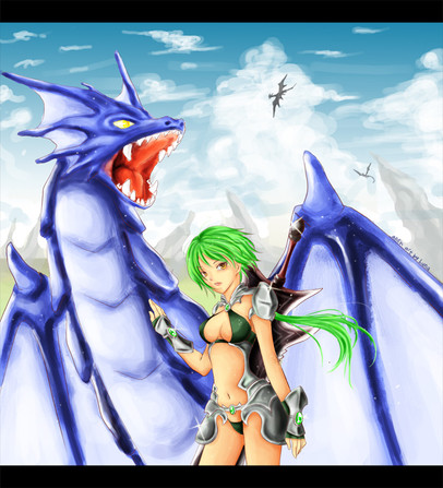 I like her expression, she looks brave and ready for action....and the dragon....is lucky to have a beautiful girl at it's back....(^_^)