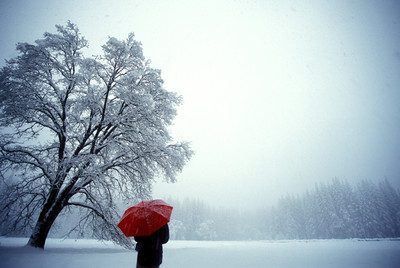 This is a picture I took in Yosemite last week. I did tweak it in photoshop a little bit by taking all the color out of the picture to enhance the red umbrella. It really looks very similar originally but the tree looks a little darker this way.shot on film. nikon w/ wide angle.